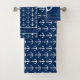 A towel set with a customisable name and a pattern of white anchors on a blue background. Simply customise the name, add these towels to your cart, and enjoy them at home.