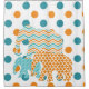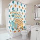 Shower curtain featuring three elephants in blue, orange, and white in patterns including diagonal stripes and chevron stripe on a background of white with big polka dots of blue and orange.