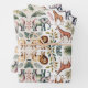 Patterned image featuring symmetrical arrangements of safari animals like lions, giraffes, and elephants surrounded by green foliage on a beige background. Vibrant and playful.