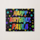This fun and vibrant birthday-themed jigsaw puzzle design has the message "HAPPY BIRTHDAY, PAULA" with the characters having a colourful rainbow spectrum inspired gradient pattern, along with a lively stars background pattern. A vibrant puzzle like this might be a fun way to acknowledge the birthday of somebody named Paula. [~Z0000468]