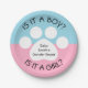 These paper plates display a white paw print on a blue and pink background and the text "Is it a boy? Is it a girl?" These plates are great for paw print themed, dog themed, cat themed, or animal themed gender reveal parties.
