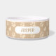 Pawsome Paw Prints Heart Pattern pet dog or cat bowl in beige shades with a name label, for the cutest furry buddy. Select the size and easily personalise the text. - Kate Eden Art