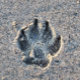 A dog pawprint in the sand on the beach.