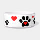 Show your doggy your love with this custom designed dog bowl! Design features black paw prints and red hearts!