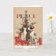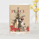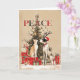 A warm and whimsical holiday scene featuring a gentle dog wearing antler branches and a Santa hat, sitting beside a curious cat who gazes up at him with quiet affection. They’re surrounded by glowing lights, a rustic Christmas tree, and a pile of bright red and green presents. Soft snowfall drifts across the image, while the word PEACE shines overhead—capturing the tender harmony of the season. Perfect for a greeting card that celebrates companionship, joy, and the simple magic of Christmastime.