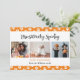 Cute orange and black photo Halloween card featuring a paw print pattern and 3 photos in the middle. Easily personalise this photo Halloween card with your images, text, and your family name.
