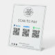 The vertical freestanding format showcases your custom logo, a clear “Scan to Pay” message, and scannable QR codes for each platform—all in one place. It’s the perfect solution for small businesses, market vendors, salons, cafés, or pop-ups looking to offer contactless payment options.