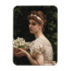 This design features a painting by the English artist Sir Edward John Poynter (1836–1919), who served as President of the Royal Academy of Arts. It depicts a beautiful young woman wearing an elegant white dress. She is standing in a garden with a basket of pea blossom flowers that she has collected. The flowers are bright white and match the girl's dress. The original artwork was painted by Edward Poynter in 1890.