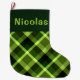 A large monogrammed Christmas stocking featuring a beautiful diagonal plaid pattern design in pea green. Create the perfect customised gift by clicking the “personalised” button to add a name or custom message in the provided template field. Select the “click to customise further” link to change the font, text size and more.