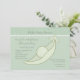 A sweet invitation, in a soft green colour, featuring one pea in a pod. The top border has a baby paisley patter and a white, scalloped trim.