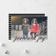 Seasonal photo card features a "Peace and Joy" black handwritten calligraphy script overlay design with custom modern serif text that can be personalised with the year and your family / name. The back of the card includes abstract white horizontal stripes with a black coloured background.
