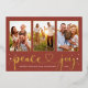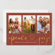 Simple and chic "Peace and Joy" holiday photo card features a collage of 3 portrait photos on a horizontal card layout with white twinkling stars and cute and modern hand-lettered calligraphy script text with heart accent in real gold foil. Personalize the greeting, family signature, and year on the front, and choose to include an additional message on the back of the card. An additional landscape photo space is included on the back. Cinnabar orange red background color can be modified.