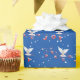 White doves flying with red PEACE and JOY messages on red and white striped strings on a blue background.