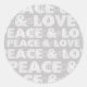 Round stickers featuring a grey background with white text that reads Peace & Love with an overlay that reads Merry Christmas in smaller white text. We have the matching holiday photo cards, postage, and address labels too!