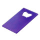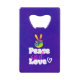 A funky cool bottle opener with peace and love written in a groovy typography font. The illustration is a hand-shaped peace symbol, fingers raised in the classic v sign all made in rainbow colours. A little doodle heart beside the word love. Psychedelic groovy design. Acid purple background.