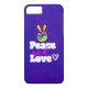 A funky cool phone case with peace and love written in a groovy typography font. The illustration is a hand-shaped peace symbol, fingers raised in the classic v sign all made in rainbow colours. A little doodle heart beside the word love. Psychedelic groovy design. Acid purple background.