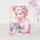 Pretty watercolor Christmas holiday card. Adorable little vintage girl in winter cap with pink flowers holding a little grey striped kitten.