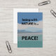 Peace Being With Nature is Peace Travel Business Card original design by Nisha Prabhu. Fully Customisable. Personalise with your details. Discover tranquillity and adventure with Peace Being With Nature, your trusted travel partner. Our business card encapsulates the essence of eco-friendly journeys and harmonious escapes. Featuring a serene landscape that invites you to explore the great outdoors. Whether you're seeking a calming retreat or an adventurous hike, Peace Being With Nature is here to guide you towards experiences that nourish your spirit and reconnect you with the earth.