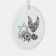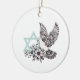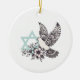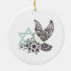 This stunning piece features a graceful dove in mid-flight, its wings outspread. The dove, rendered in soft white tones with a boho pattern, contrasts beautifully against the backdrop of a solid blue Star of David.