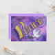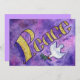 The word "Peace" is painted in a soft golden yellow against a pink and purple background. A dove of peace holds an olive branch in its beak. The watercolor painting has a textural contrast and sparkle from a light layer of glitter. Customise this invitation with your own text and resize the painting, as needed.