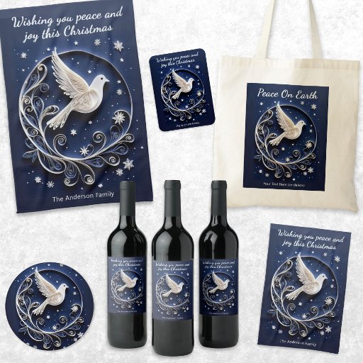 Send peaceful Christmas greetings with this elegant illustrated holiday magnet. The magnet is illustrated with a dove, a traditional symbol of peace. The white dove is in a dark blue sky with stars and snowflakes. While the picture is printed flat, it gives an eye-catching paper craft appearance, as if the dove is flying out of the picture. The greeting at the top is 'Wishing you peace and joy this Christmas', Personalise the festive magnet with your name(s) or other words, for an individual finishing touch.