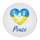 Show support for the people of Ukraine with this round cutting board featuring a peace dove silhouette on a heart shaped flag of Ukraine