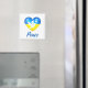 Show support for the people of Ukraine with this fridge magnet featuring a peace dove silhouette on a heart shaped flag of Ukraine