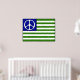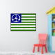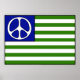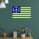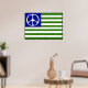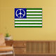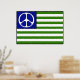 Blue, white and green flag with a peace symbol in place of the stars gets the word out that Peace must be part of saving the planet because war is a destructive force that affects us and the planet. Spread the message that ending war will save the earth.