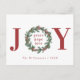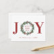 A typographic holiday postcard with JOY as the main headline in red, and a watercolor holly and berries wreath making the 'O' with "peace hope love" in the centre. The reverse has an editable message in dark green.