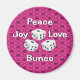 Here is an inspirational graphic design for you to share with other bunco players. This positive message states: Peace, Joy, Love and Bunco. Buy one as a gift or prize. Personalise with your own name, group name or date.