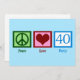 Peace Love Forty birthday card. A pretty peace sign, heart, and the number 40 in beautiful blue for a fortieth birthday party.