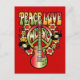 Retro-style type design of PEACE LOVE MUSIC with peace symbol, guitar, flowers and musical notes in red, yellow and green gradients.