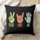 This bold and modern throw pillow features three iconic hand signs: the peace sign, the love hand gesture, and an open palm symbolising art. With soft pastel tones of green, orange, and cream against a black background, this design delivers a simple yet powerful message: Peace, Love, Art.