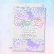 Peace Love Baby Baby Shower Invitation with pastel tie dye pattern in shades of lilace and blue. The design features groovy retro lettering and 70's style hearts flowers rainbows and peace sign. Easy to customise and versatile to suit all sorts of themes such as tie dye party, 60's or 70's theme, pool party etc.