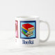 A cute librarian Christmas gift featuring a peace sign, heart, and a stack of novels. Peace Love Books makes a good present for an author, writer, or novelist. Pretty bookworm mug for a teacher or book club member.