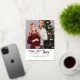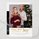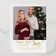 Peace Love and a bundle of Joy pregnancy announcement christmas card with simple photo and typographic design in luxury gold foil. Peace Love and a bundle of Joy is lettered in modern contemporary lettering and the photo template is set up for you to add 2 photos, one on the front and one on the back. You can also add your personalised holiday greeting with baby due date. Your photos are displayed in square format so, if you have any problems with placement, try cropping your picture to a square and re-uploading.