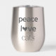 This modern Peace • Love • Cats graphic print statement tumbler is designed to add joy to your wine time. The charcoal text makes this simple, uplifting, and versatile enough for any style esthetic. Channel good vibes and more time with your fur-baby with this motivational insulated wine tumbler.