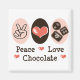 Peace symbol, heart and three pieces of decadent chocolate candy on chocolate lover shirts, apparel, stationery and more merchandise a chocoholic is sure to love.
