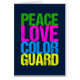 A cute colorguard gift for someone who performs flag spinning with the marching band in school. Peace Love Colour Guard is written in pretty green, hot pink, blue, and neon yellow.