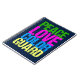 A cute colorguard gift for someone who performs flag spinning with the marching band in school. Peace Love Colour Guard is written in pretty green, hot pink, blue, and neon yellow.