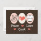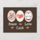 Peace symbol, heart and chef's hat toque in pink and dark brown on cooking t shirts, apparel, stationery and more merchandise that make a cute gift for a gourmet chef, cook or cooking class or culinary school student.