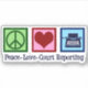 Peace Love Court Reporting. A cool court reporter gift for a typist who is known as a guardian of the record in the judicial process of law. Cute present for someone who works in a deposition proceeding to create a legal transcript.