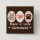 Show your love for your favourite breed of dog with our cute pink and dark brown peace symbol, heart and paw print design with the words Peace Love Dachshund on t-shirts, tees, apparel and more dog lover gifts for the whole family. Click here to see all of our cute and original Chrissy H.