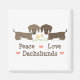 Show your love for your favourite breed of dog with this cute Peace Love Dachshunds design on t-shirts, tees, apparel and more doxie lover gifts for the whole family. Two adorable smooth short haired dachies stand in the grass and take time to smell the flowers. Click here to see all of our cute and original Chrissy H. Artwork © Chrissy H. Studios, LLC. All Rights Reserved.