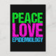 A cool epidemiologist gift for someone who studies public health and preventative healthcare. It features Peace Love Epidemiology written in distressed neon font of pink, green, and blue for a cute vintage look for this occupation.