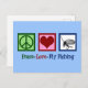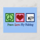 A cute fly fishing Christmas gift featuring a peace sign, heart, and a fisherman's hook with a fly on it. Peace Love Fly Fishing present.