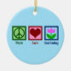A beautiful gardening gift for a gardener who loves to plant flowers in the garden on a nice, sunny day. PEACE LOVE GARDENING features a green peace sign, red heart and a shovel in the soil next to a pretty tulip.