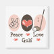 Peace symbol, heart, golf club and golf ball in pink and dark brown on cute golf t shirts, apparel and more golfer merchandise and gifts for a true golf lover.