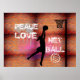 Peace, love graffiti netball quote with goal shooter player silhouette and brick wall background.