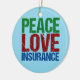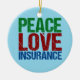 A cute insurance agent Christmas present featuring green, red, and blue letters that read Peace Love Insurance. Great gift for your insurance company co-workers.